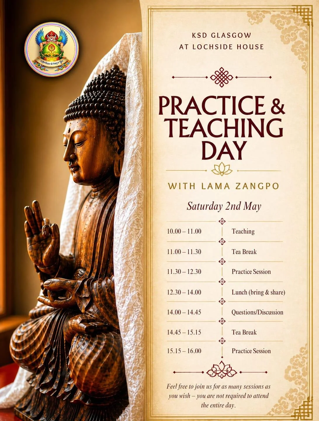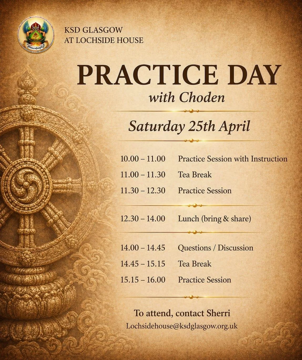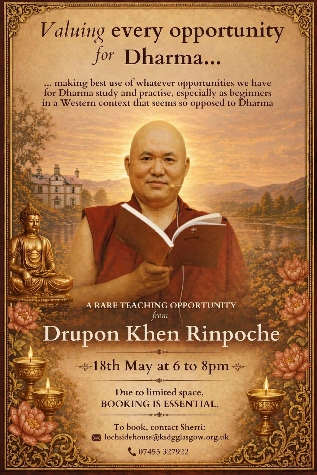 We are very grateful and blessed to have Drupon Khen Rinpoche visit Lochside house on May 18th 2026, 6pm to 8pm, to kindly offer a teaching. Please contact Sherri at Lochsidehouse@ksdglasgow.org.uk or whatsapp 07455 327922 to book a place; let Sherri know whether you plan to attend via public transport or car . We recommended car sharing where public transport is not possible .
